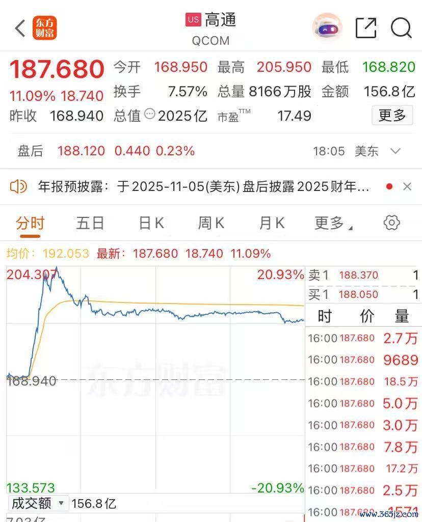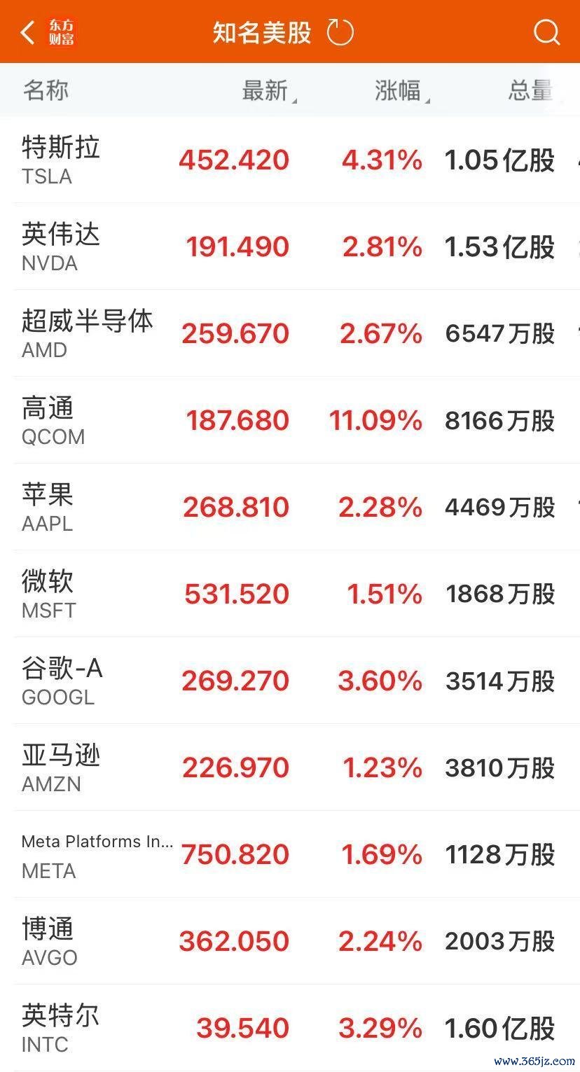半导体股普遍上涨,高通涨超11%,英特尔涨超3%,AMD涨超2%。
