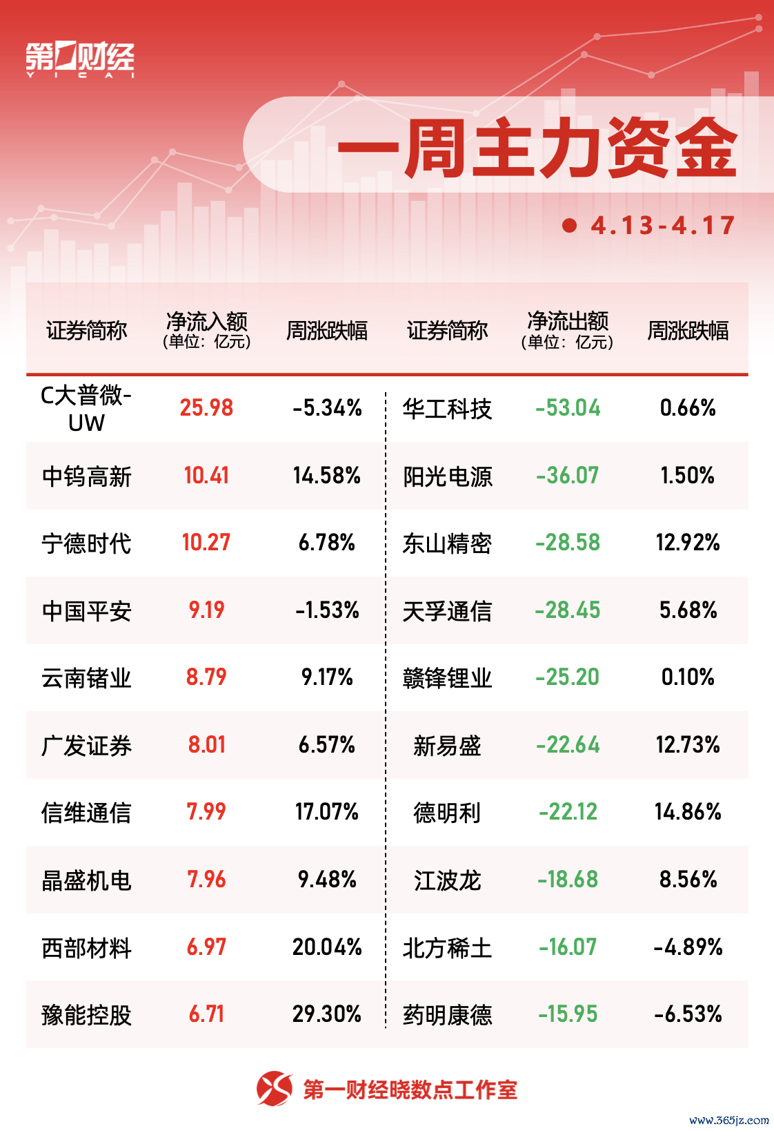 个股方面,本周C大普微-UW获净流入25.98亿元居首,周跌5.34%。中钨高新、宁德时代主力净流入分别为10.41亿元、10.27亿元。净流出方面,华工科技、阳光电源、东山精密分别遭抛售53.04亿元、36.07亿元、28.58亿元。