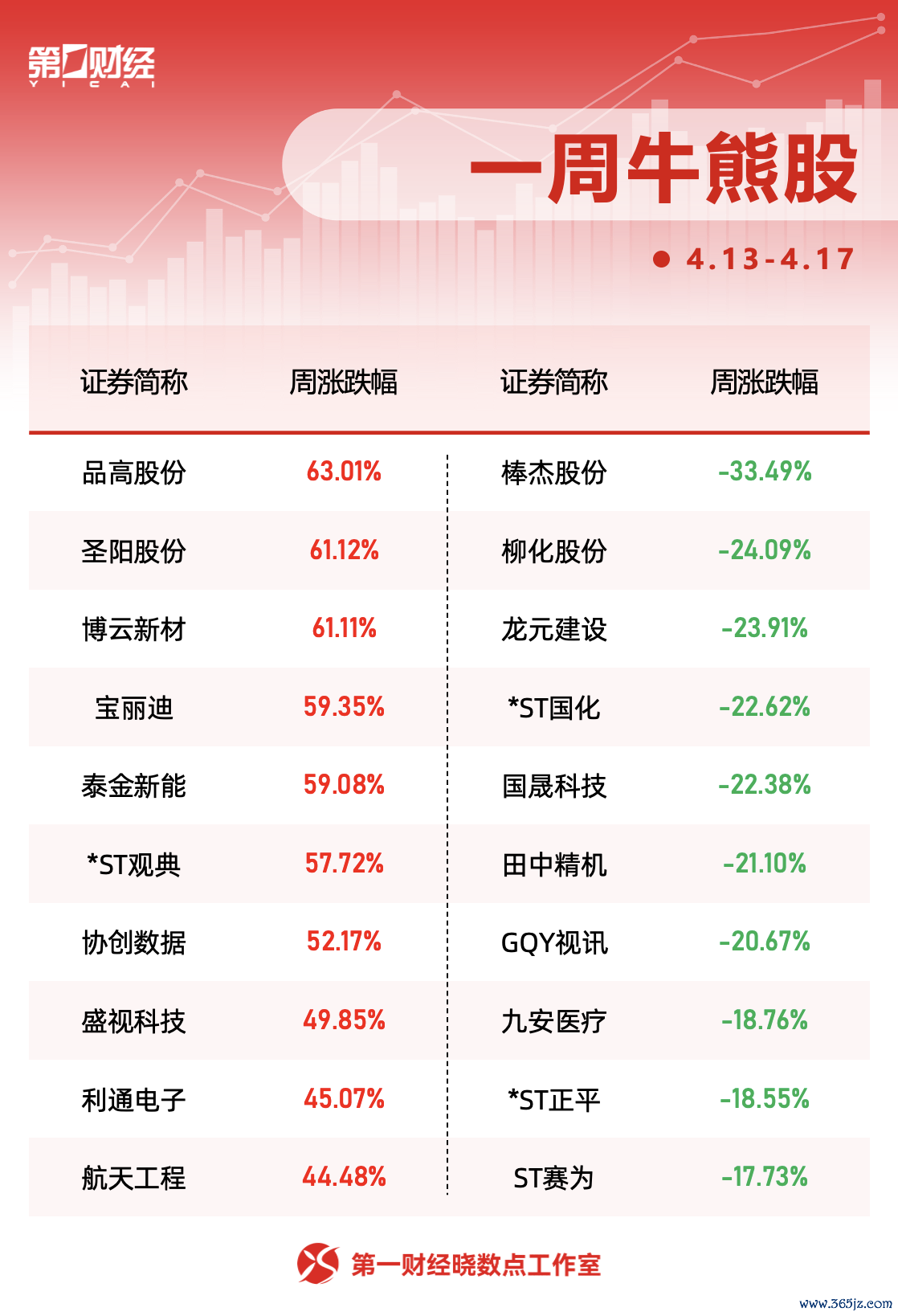 品高股份本周涨幅居首,周涨幅达62.01%。圣阳股份、博云新材、宝丽迪周涨幅居前,分别为61.12%、61.11%、59.35%。