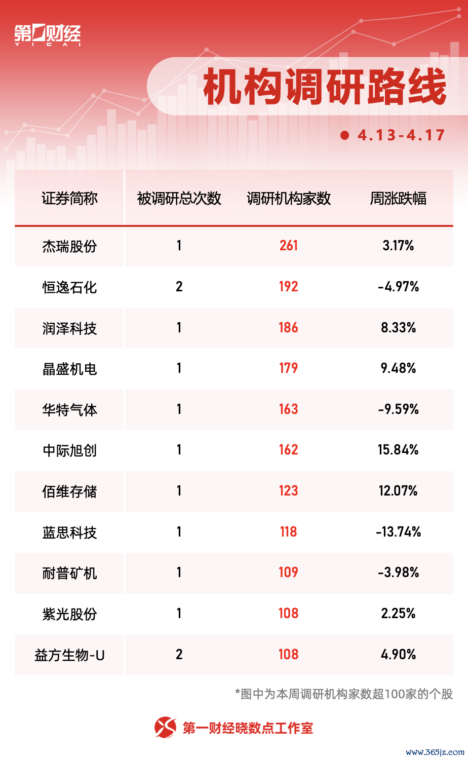 Wind数据显示,机构本周(4月13日至4月17日)共调研了363家上市公司,其中杰瑞股份最获关注,参与调研的机构为261家。恒逸石化、润泽科技、晶盛机电分别获192家、186家、179家机构调研。