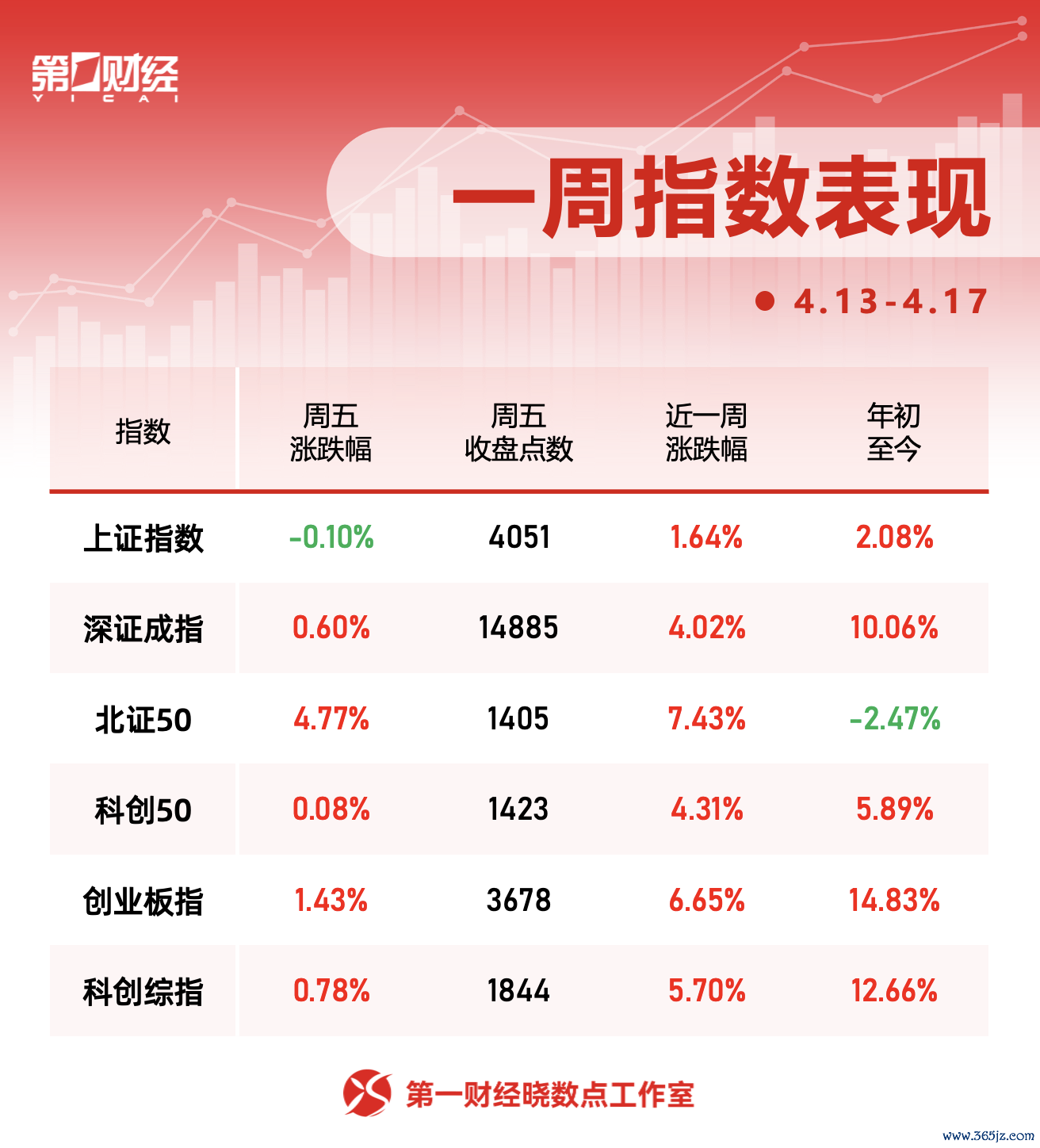本周(4月13日至4月17日)A股指数均累计上涨,沪指本周累计涨1.64%,深成指涨4.02%,创业板指涨6.65%,科创综指涨5.70%。