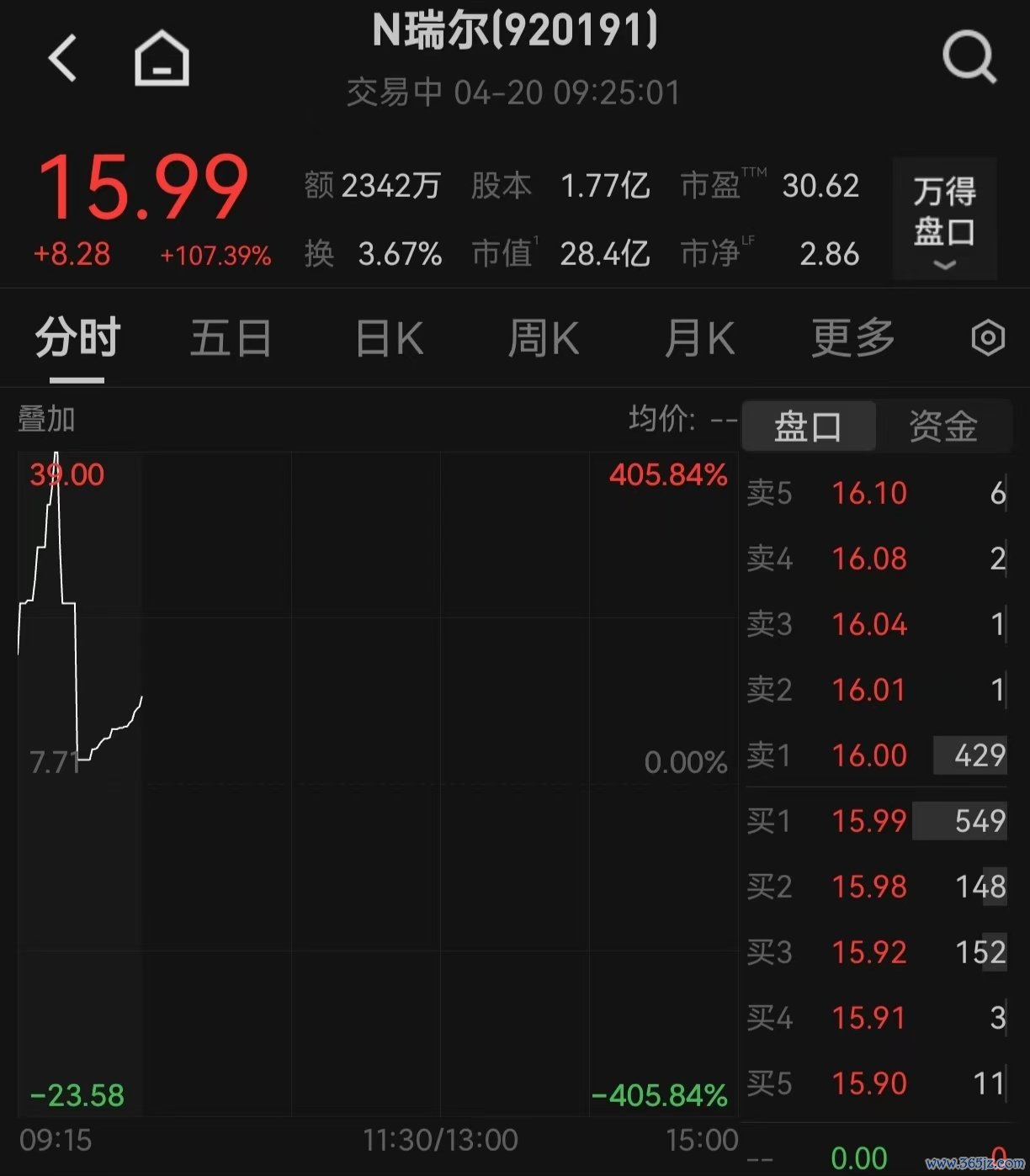 个股方面,N瑞尔在北京证券交易所上市,上市首日开盘大涨107.39%,报15.99元,当前总市值达28.37亿元。