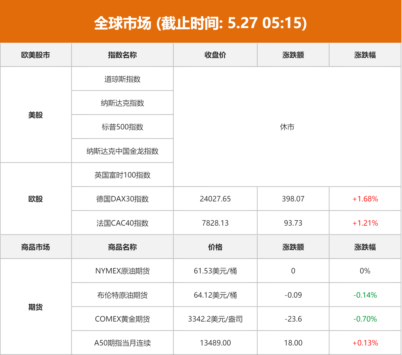 欧股:法国巴黎股市CAC40指数报收于7828.13点,较前一交易日上涨93.73点,涨幅为1.21%;德国法兰克福股市DAX指数报收于24027.65点,较前一交易日上涨398.07点,涨幅为1.68%。英国伦敦股市26日休市。